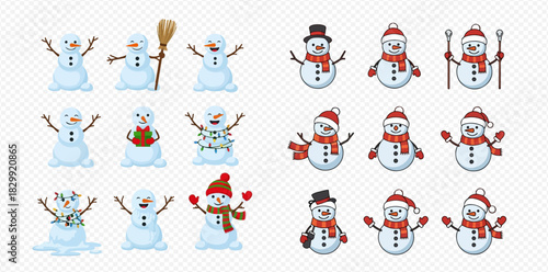 © MuammarAuliyan, Obraz premium Collection of cartoon snowmen wearing hats and scarves in various poses.