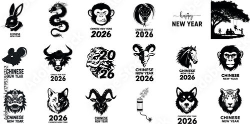 © Graphic EngineerBD, Naklejka premium Collection of chinese zodiac animals and symbols for the new year celebration in a black and white artistic style