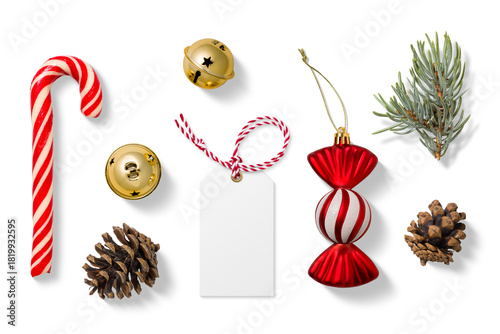 Fototapeta premium Collection of Christmas-themed elements on a transparent background, featuring a red and white candy cane, gold jingle bells, spruce branches, pine cones, a blank gift tag and festive candy ornament.