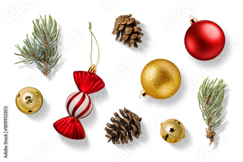 © PrimeMockup, Fototapeta premium Collection of Christmas-themed elements on a transparent background, featuring a red and white candy cane, gold jingle bells, spruce branches, pine cones, red and gold bauble and candy ornament.