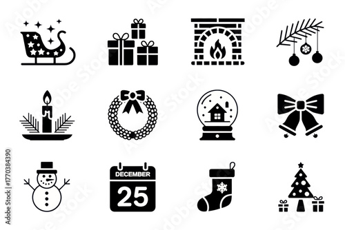 © tahir xh, Naklejka premium Collection of christmas themed icons including a sleigh gifts fireplace and christmas tree design