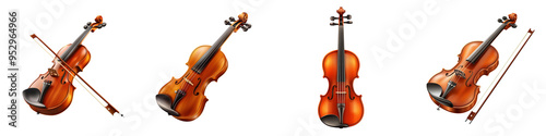 Fototapeta premium Collection of classical violins with bows isolated on white background. Perfect for music and instrument related projects and designs.