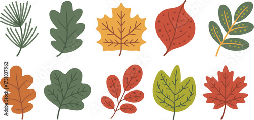 Obraz premium Collection of colorful autumn leaves vector illustration, fall season foliage design, decorative botanical elements, nature clipart, simple leaf icons set