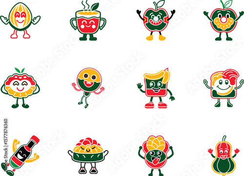 Naklejka premium Collection of colorful food item characters with cartoonish expressions stand...