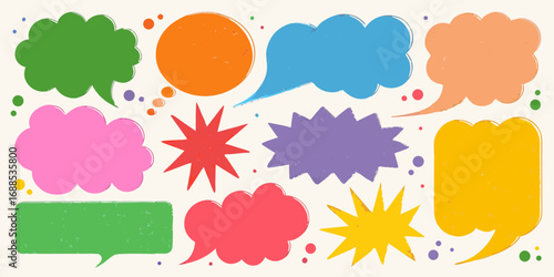 © Ramanath, Fototapeta premium Collection of colorful hand drawn speech bubbles and starburst shapes with dots on a light background