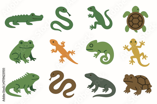 Fototapeta premium Collection of colorful reptile illustrations featuring crocodiles, snakes, lizards, frogs, turtles