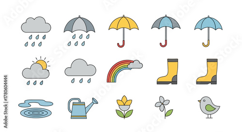 Fototapeta premium Collection of colorful spring weather icons including rain clouds, umbrellas, boots, watering can, flowers and a bird