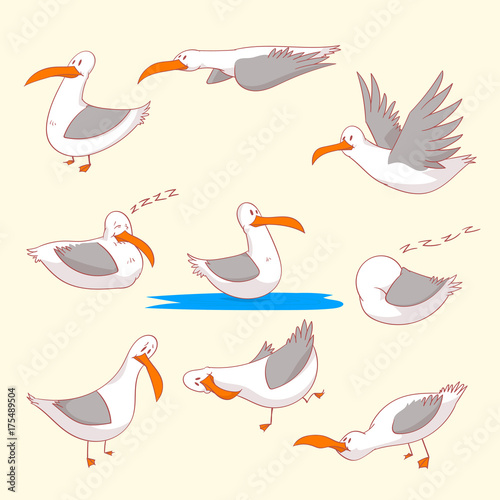 Naklejka premium Collection of colorful vector illustrations of cartoon marine burds or seagulls in different positions