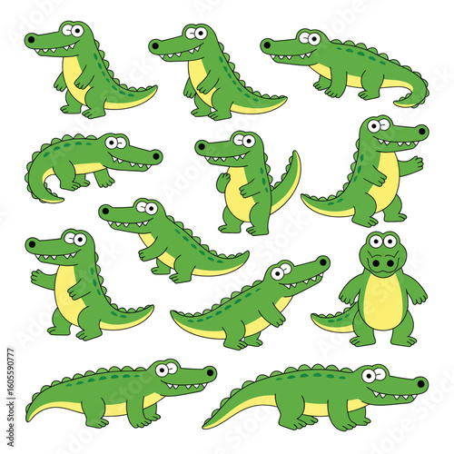 Fototapeta premium Collection of cute cartoon alligators in various poses and expressions