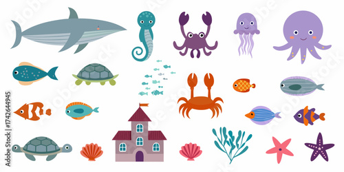 © Bithi, Naklejka premium Collection of cute cartoon sea creatures and underwater elements for children