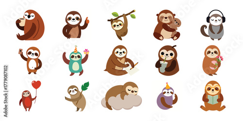 Obraz premium Collection of cute cartoon sloths in various poses and activities for childrens designs