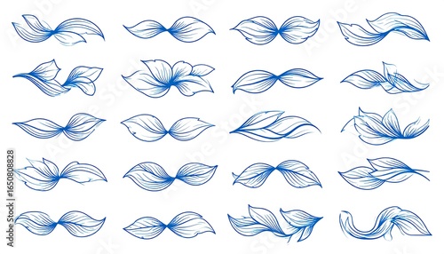 Fototapeta premium Collection of decorative, stylized leaf designs in shades of blue.