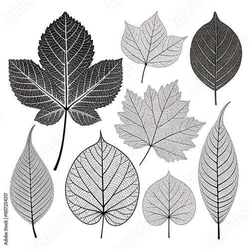 Obraz premium Collection of detailed black and white leaf imprints with intricate vein...