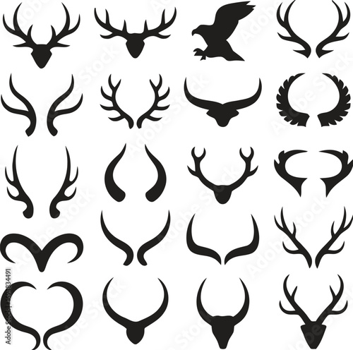 © Muhammad, Fototapeta premium Collection of diverse animal antlers horns and silhouette eagle wings