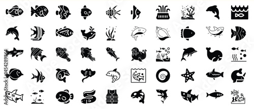 © vector Art, Naklejka premium Collection of diverse black and white ocean animal illustrations on white background