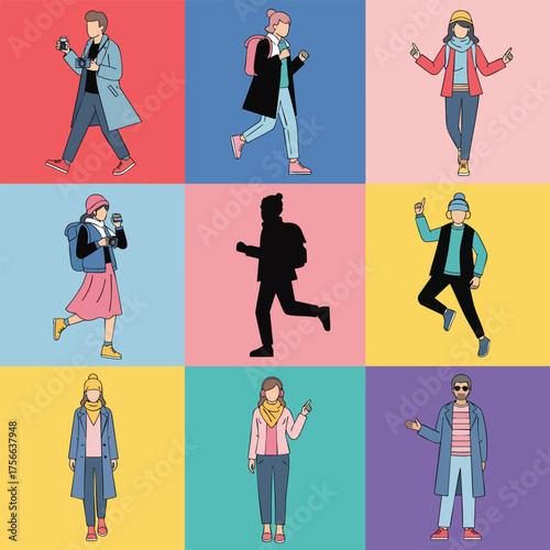 © Vira, Naklejka premium Collection of diverse cartoon characters in stylish modern outfits including a running silhouette.