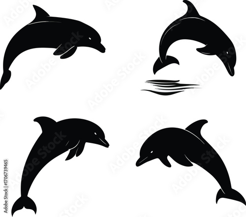 Fototapeta premium Collection of diverse dolphin jumping silhouettes isolated on white background