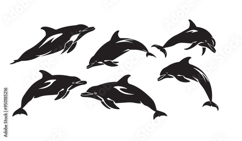 © movinglines.studio, Naklejka premium Collection of Dolphin Silhouettes in Various Poses Isolated on White Background