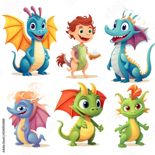 Obraz premium Collection of Dragon and Fairy Tale Cartoon Characters in Vibrant Colors