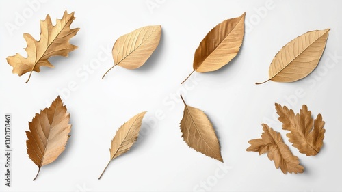 Obraz premium Collection of dried, golden leaves arranged on a white background, perfect...