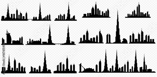 Naklejka premium Collection of Dubai skyline silhouettes, showcasing various angles and...