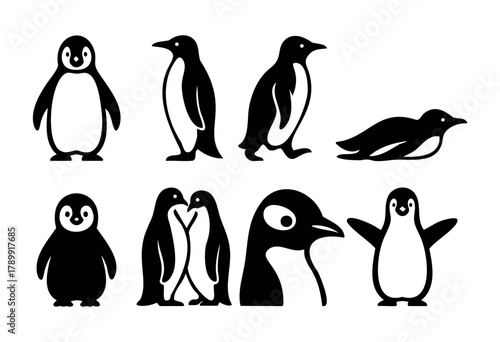 Naklejka premium Collection of eight black and white penguin illustrations in various poses...