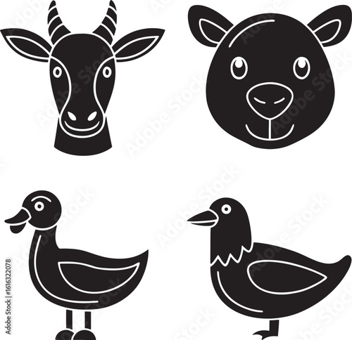 Naklejka premium Collection of eight distinct black silhouette farm animals including cows horses pigs sheep chickens and ducks ideal for rustic countryside or agricultural themed designs