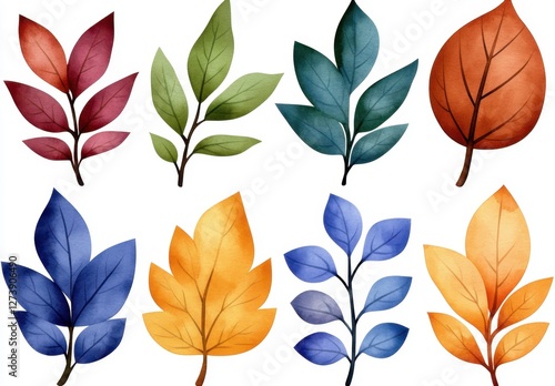© A4719, Fototapeta premium Collection of eight watercolor leaves in various autumnal colors deep red, green, teal, burnt orange, navy blue, golden yellow, and muted purple.