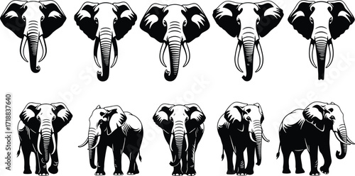 Fototapeta premium Collection of elegant elephant illustrations, black and white animal graphics, wildlife vector art, perfect for logos, tattoos, designs, and nature themes