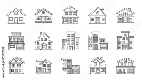 Fototapeta premium Collection of fifteen outline icons representing houses and apartment building styles