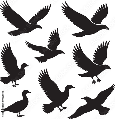 Fototapeta premium Collection of flying bird silhouettes on white background Keywords: eagle, bird, flying, silhouette