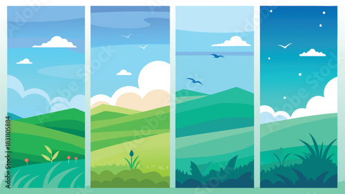 © zihad, Fototapeta premium collection of four banners displaying various mountain and tree scenes, highlighting nature's splendor..eps