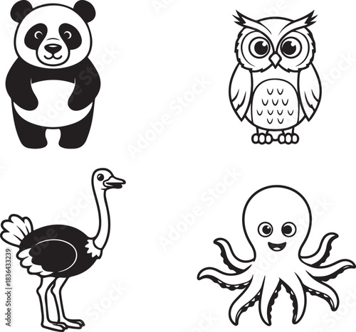 Fototapeta premium Collection of four cartoon animals panda owl ostrich and octopus