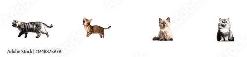 © Maestro, Obraz premium Collection of four domestic cats and kittens with diverse poses on a black background, cut out transparent