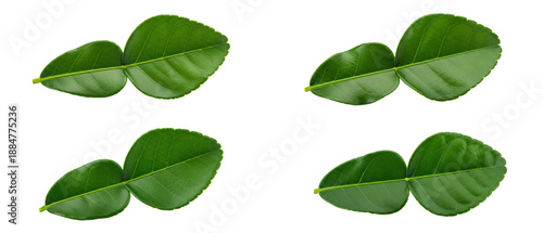 © nurman, Fototapeta premium Collection of four fresh green kaffir lime leaves isolated on a white background.