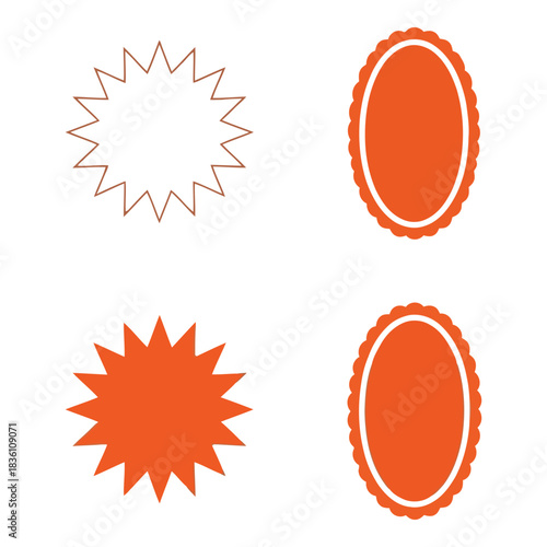 Fototapeta premium Collection of four graphic elements: a starburst shape and three oval shapes, two orange and one outline.