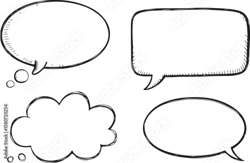 Fototapeta premium Collection of four hand drawn speech and thought bubbles in black ink on...