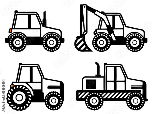 Naklejka premium Collection of four stylized black and white construction and farm vehicle icons