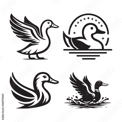 Obraz premium Collection of four stylized black and white duck illustrations in different...