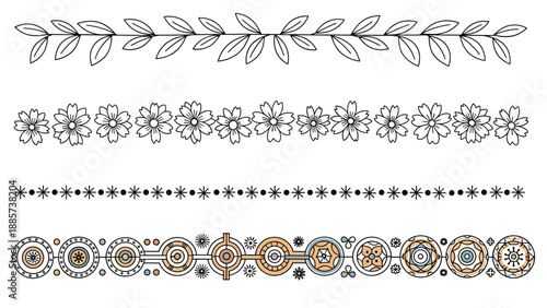 Fototapeta premium Collection of four unique horizontal border designs featuring floral...