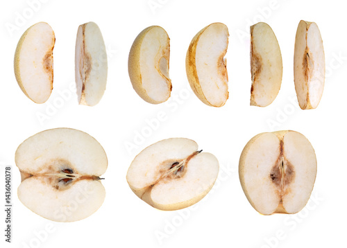 © CineStock Studio, Fototapeta premium Collection of fresh and sweet pear slices in various compositions and angles, isolated on white background