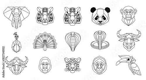Fototapeta premium Collection of geometric animal head outlines in black and white, including elephant, tiger, panda, monkey, peacock, cobra, and bull.