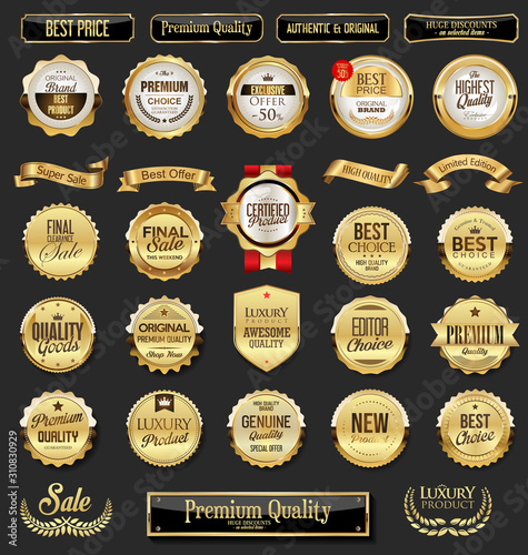 © totallyout, Obraz premium Collection of golden badges and labels retro style