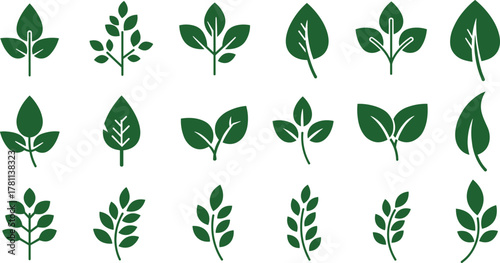© Moksedul Creative, Naklejka premium Collection of green leaf vector icons, eco nature symbols, organic plant illustrations for sustainable design, environment, and botanical graphics