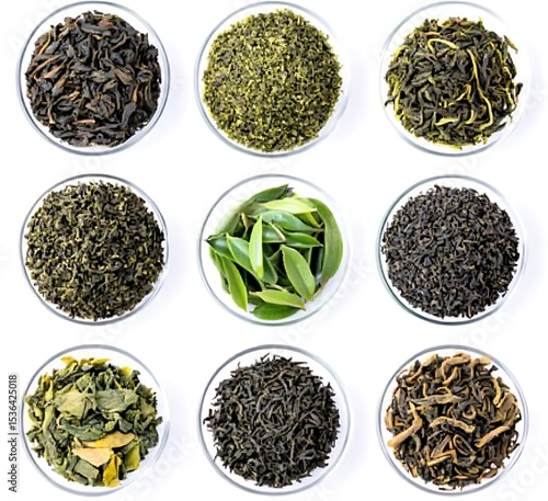 © Amir, Fototapeta premium Collection of green tea top view close-up set isolated on white background ,