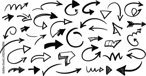 © Nur-Nobin Creations, Naklejka premium Collection of hand drawn black arrows vector illustration featuring sketch doodle styles and grunge markers isolated on white background.