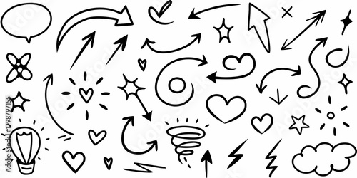 Obraz premium Collection of hand drawn black doodle elements including arrows hearts stars light bulb speech bubble and cloud