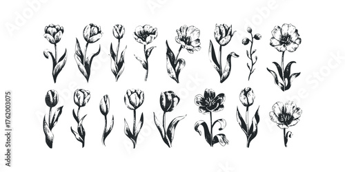 Naklejka premium Collection of Hand Drawn Black Ink Tulip Flowers