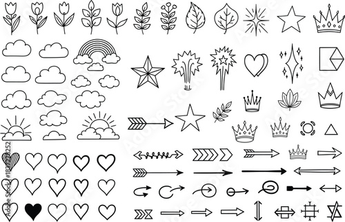 Fototapeta premium Collection of hand drawn doodle icons including hearts stars clouds rainbow and crowns