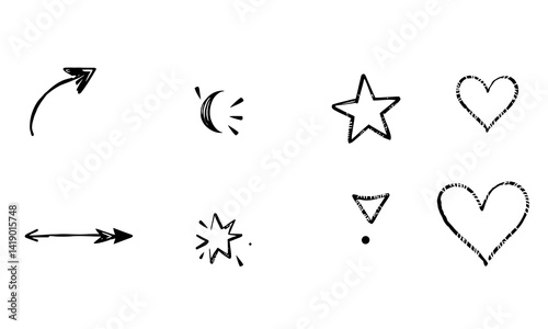 © RooftopStudioBangkok, Naklejka premium collection of hand drawn doodles featuring arrows, stars, hearts, and other decorative elements, perfect for adding playful touch to designs